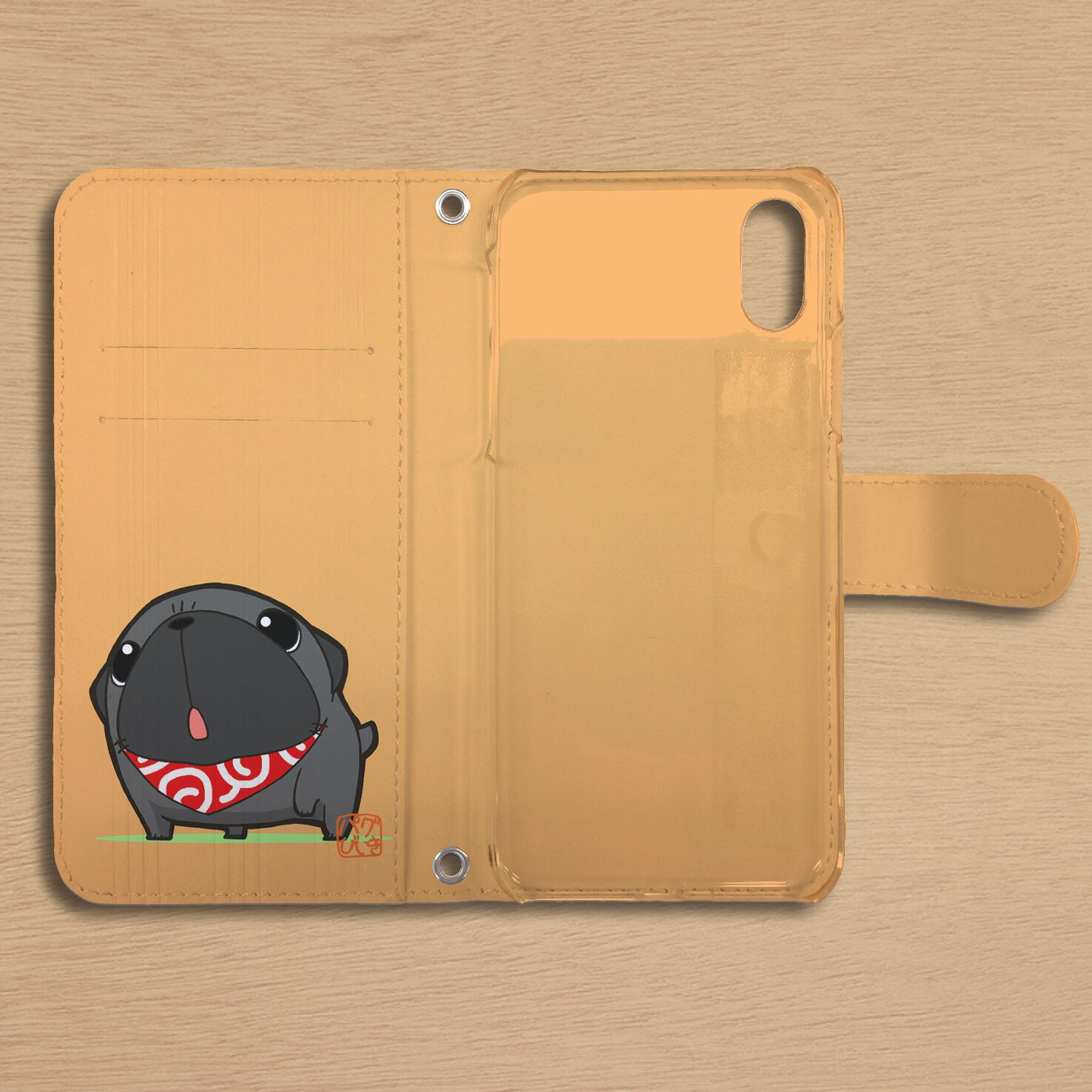 スタンド付き 両面印刷 手帳型 iphoneケース パグカップ(黒パグ)